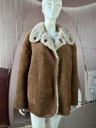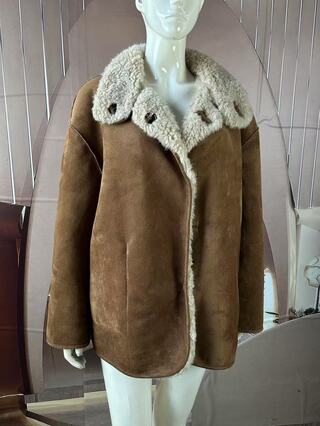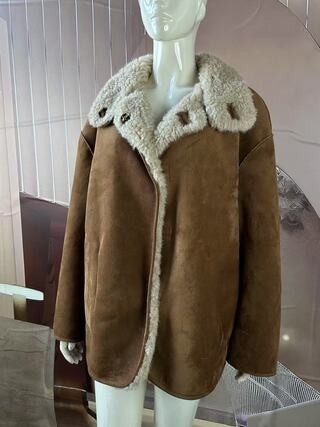 This jacket is made of suede blended with shearling, and the buttons on the shearling collar are particularly distinctive.