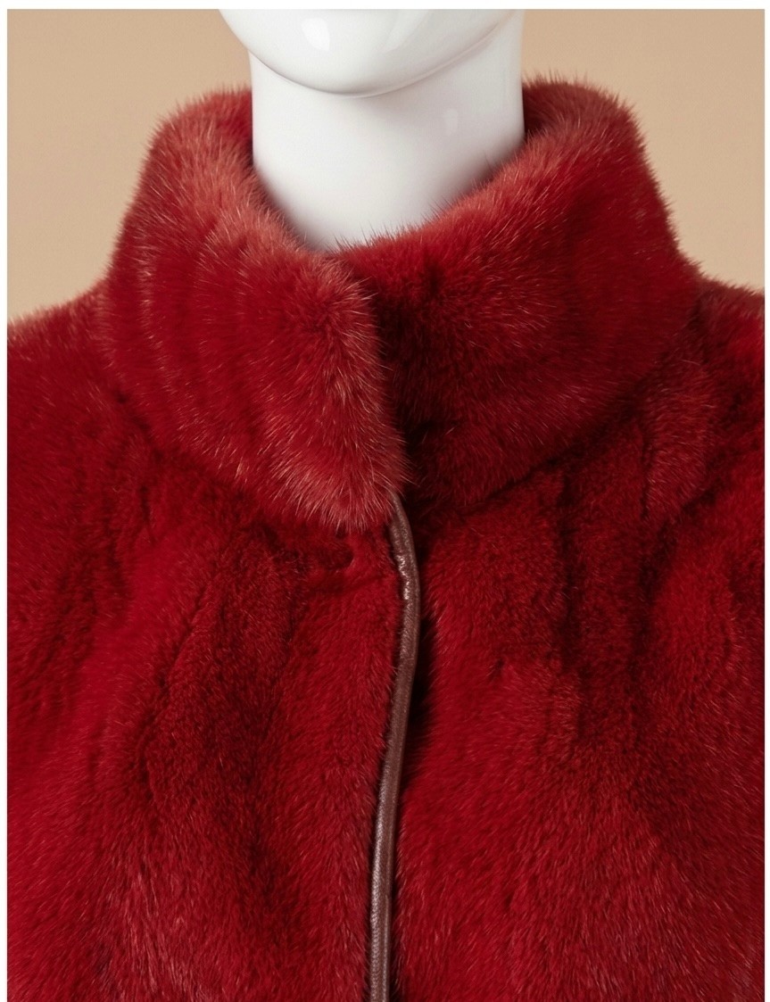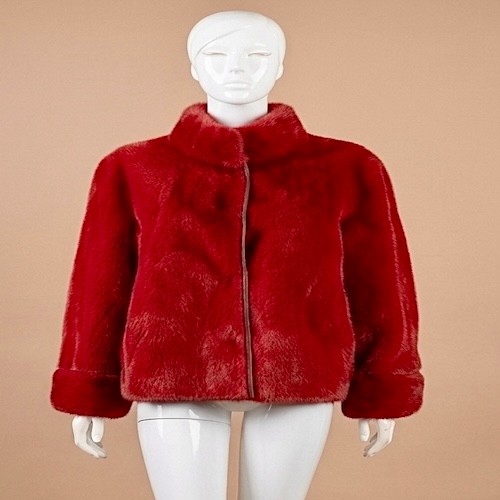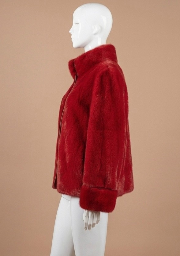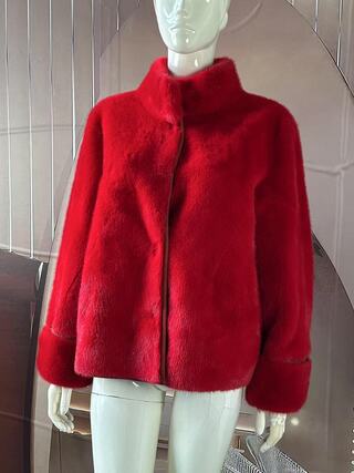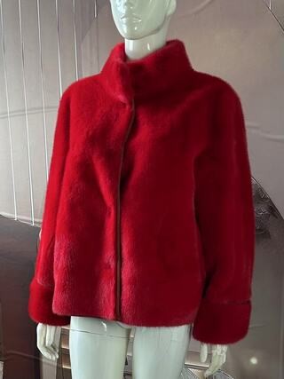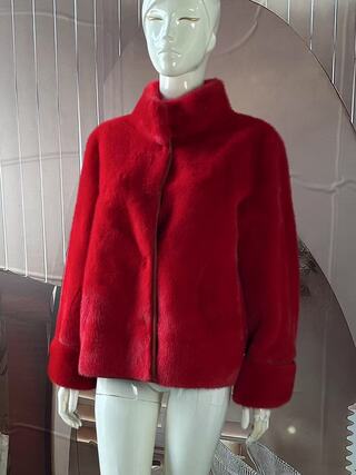 The jacket is made of faux mink fur, soft and comfortable, with a vibrant red color that exudes elegance and charm.