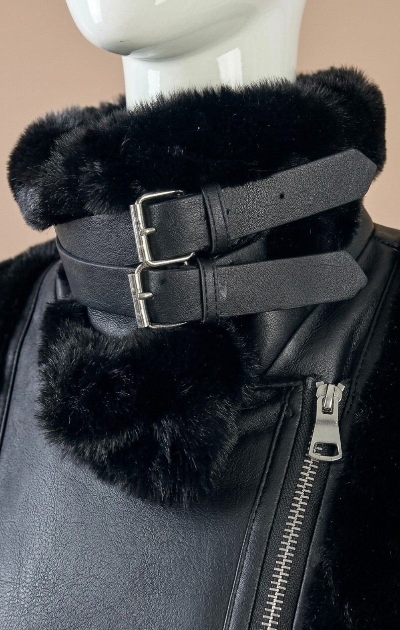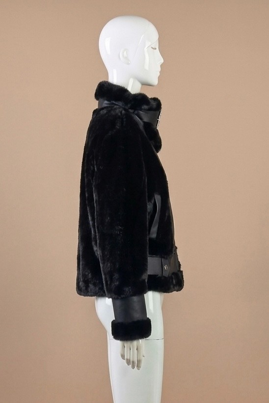 This jacket is made of faux mink fur bonded with PU , combined with elements like zippers and leather buckles, showcasing great design and a strong sense of fashion.
