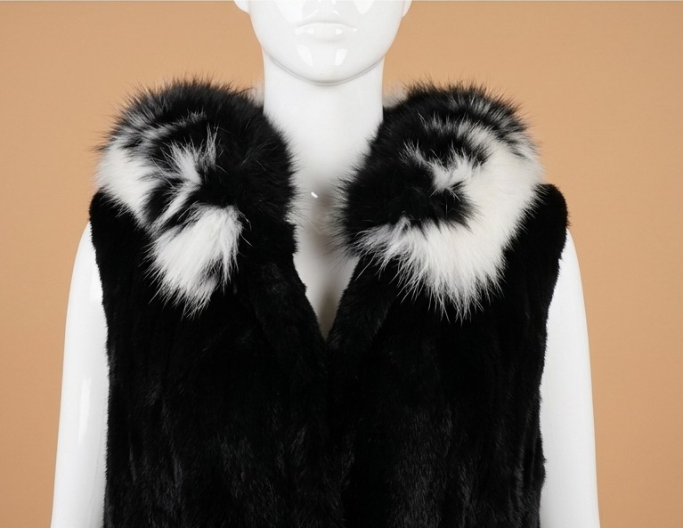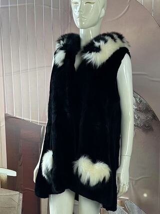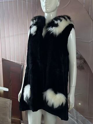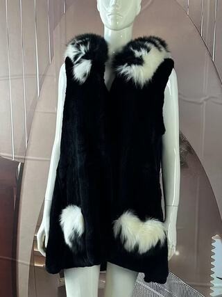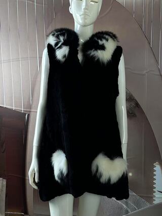 This sleeveless coat is made of faux rabbit fur, with faux fox fur used for the collar and pockets as the finishing touches.