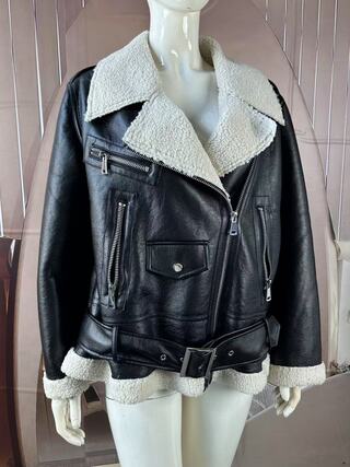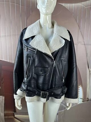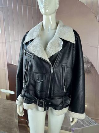 This jacket is mainly made of PU bonded with shearling on the collar, cuffs, and hem, and features multiple pockets, giving it a highly designed and fashionable look.